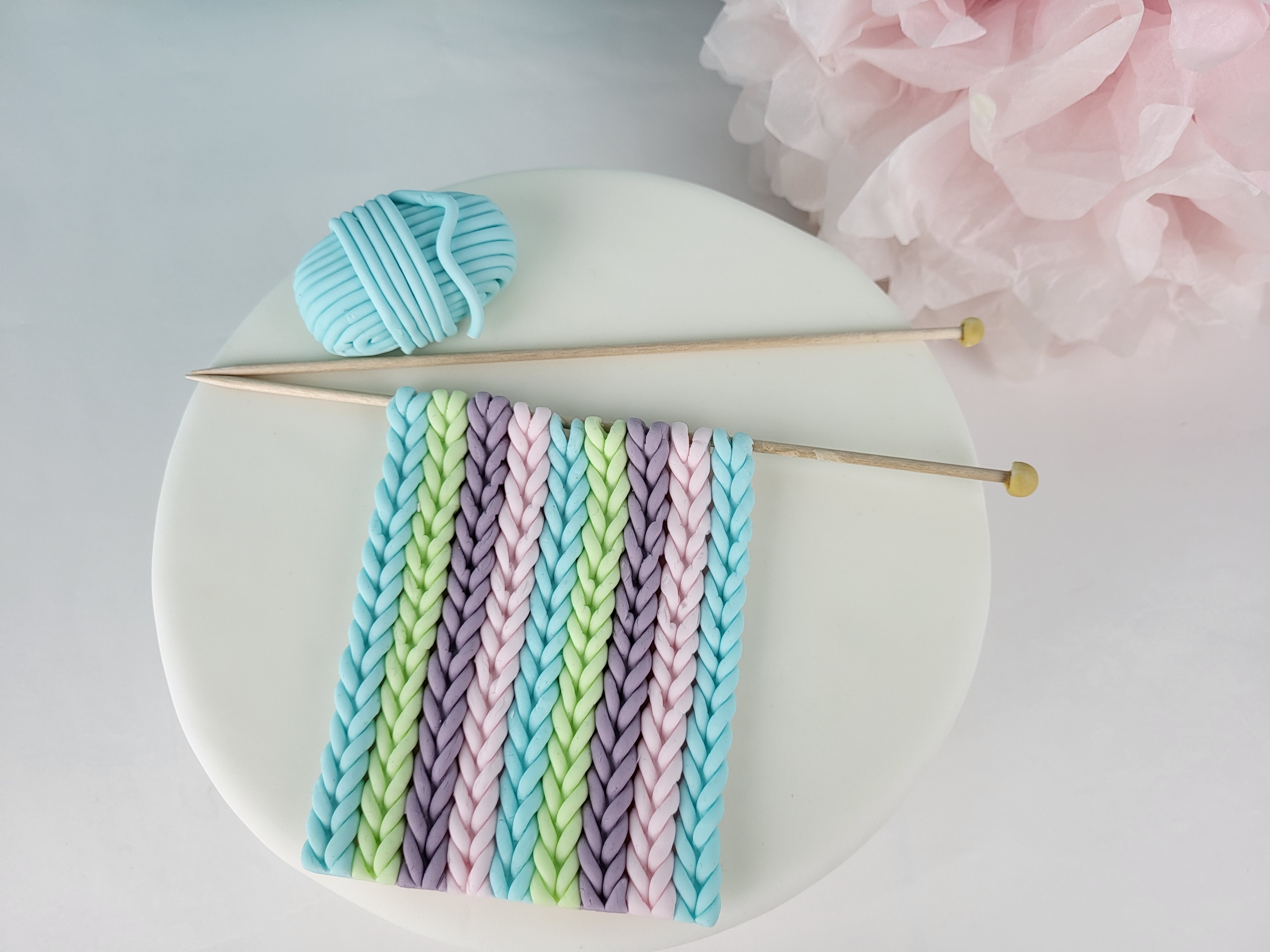Gefertigt aus Fondant. Stricknadeln aus Holz.