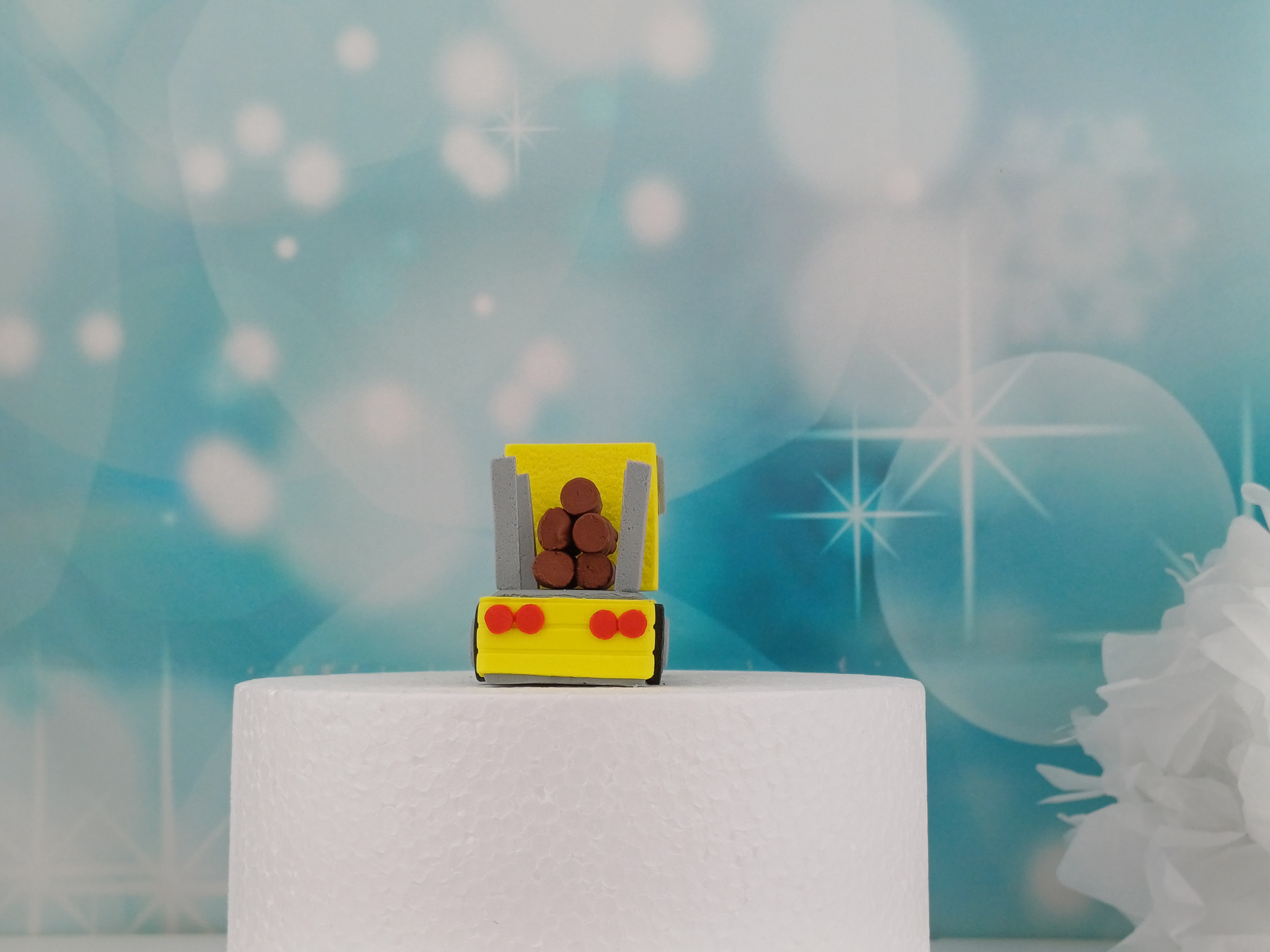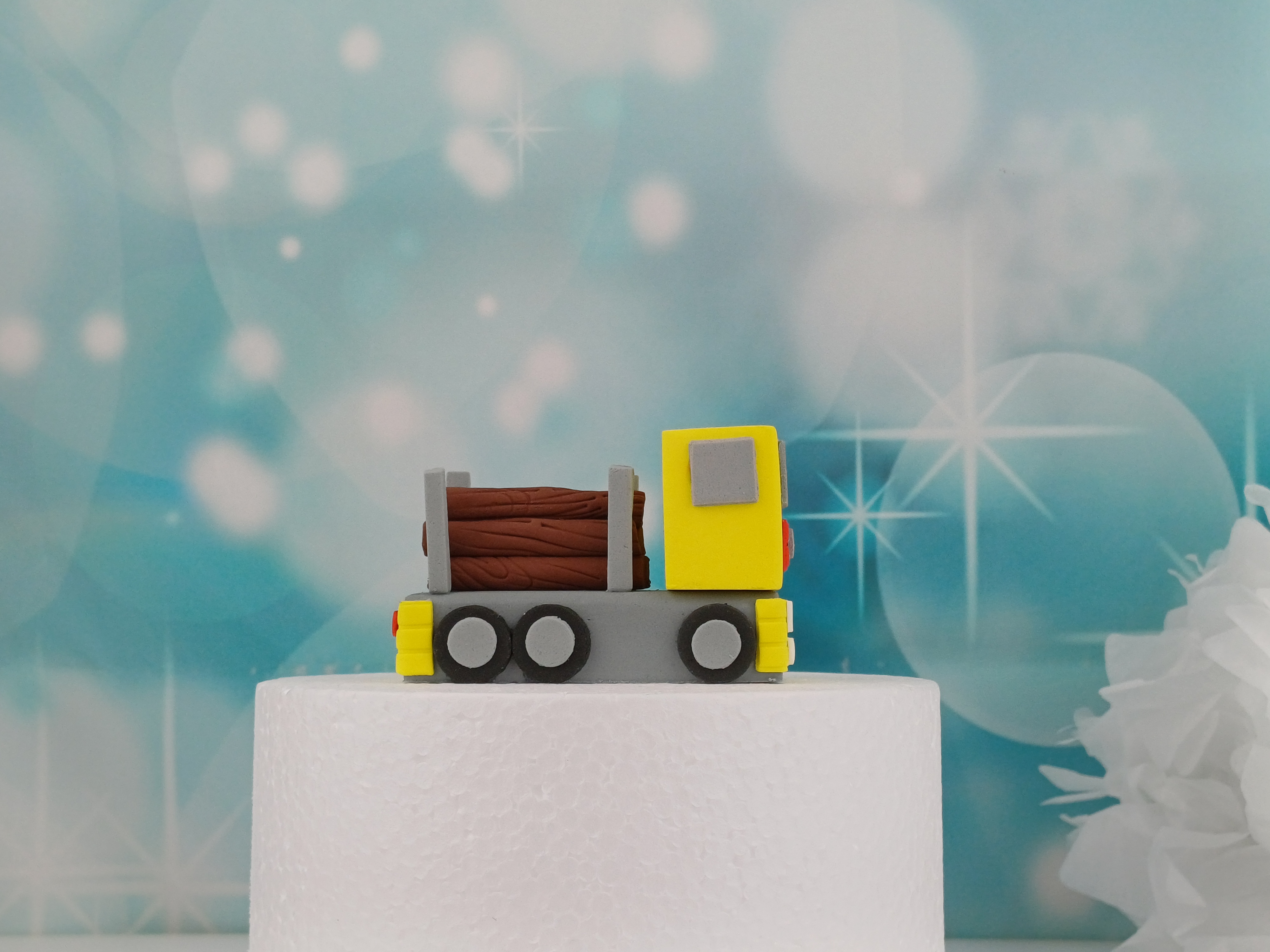 Hergestellt aus hochwertiger Zuckermasse, sind die Baumstämme und der Transporter handgefertigt und sorgfältig modelliert. Die feinen Details und die lebendigen Farben machen diese Tortenfigur zu einem herausragenden Dekorelement, das Ihre Kreationen zum Leben erweckt.