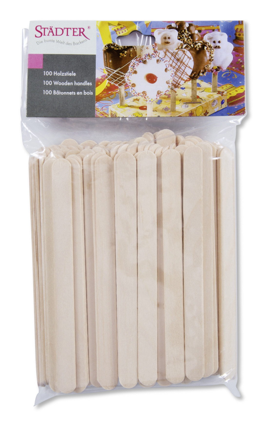 Die passenden Holzstiele für Lollys aus Eis, Schokolade oder Marzipan und natürlich die beliebten Lollycakes – stick it! Die Holzstiele sind aus unbehandeltem Holz hergestellt. Zum einmaligen Gebrauch. In Sichtverpackung zum Aufhängen Material Buche