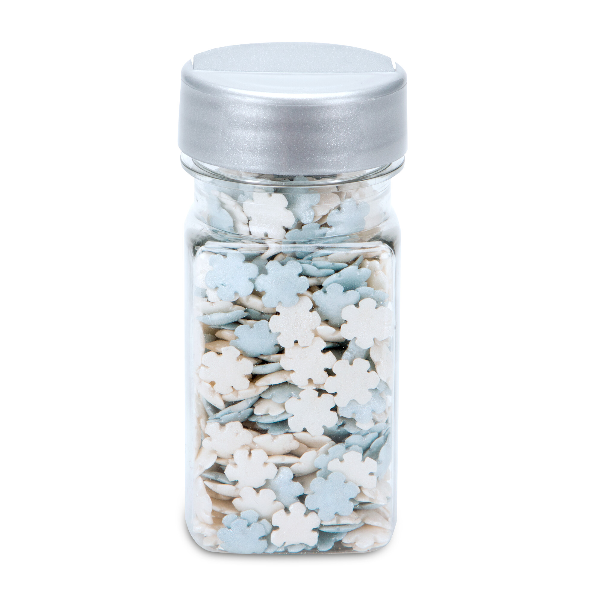 In dieser Dose finden Sie kleine süße Dekorzuckerteile als Schneeflockenmotiv.